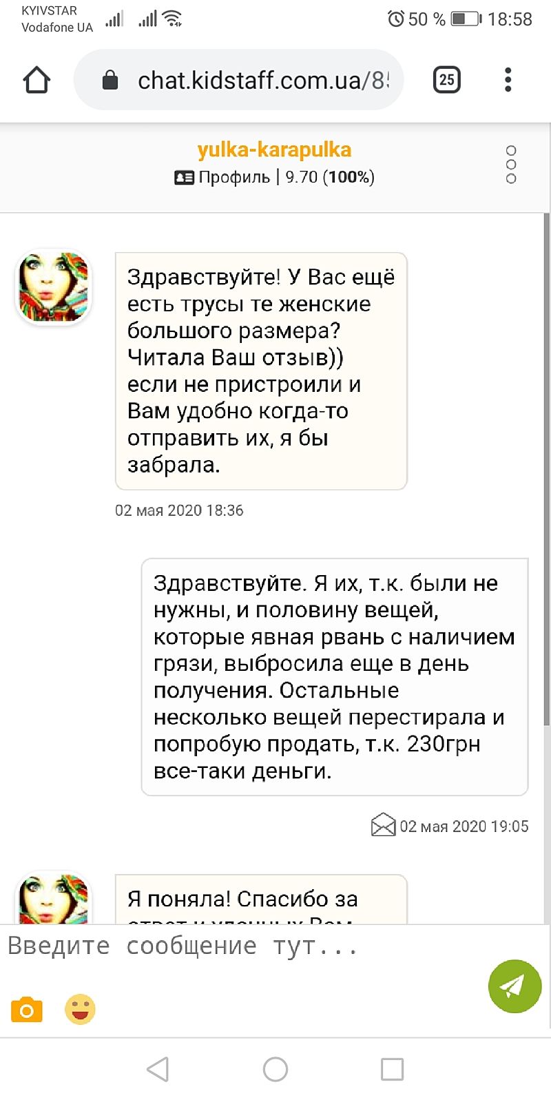 вы пожалуйста фото выкладывайте рванья сюда -так писать можно все грязь ,волосы, пятна - это стандартный набор известен всем тем более что по правилам сайта это можно делать бездоказательно ,админ не запрашивает фото дефектов , грязи ,пятен - ВЫ АКЦЕНТИРУЕТЕ только на хламе - который вам был ДАРОМ отослан - ни одного доказательства в фото вы как покупатель не показали что вещь другая выслана мной -в этой части моей просьбы -вы становитесь глухая и слепая опуская этот момент - что это клевета - вы сами в предыдущем посте проговорились в ответе ’ Джинсы меньше в полуобъеме на 1см, в объеме это 2 см, оказались малы, ’ - так какие вам джинсы малы? я же по вашим словам выслала вам другие не ,что в объявлении - ГДЕ ПРАВДА а?? фото вы не даете только потому ,что раскроется ваша ЛОЖЬ !