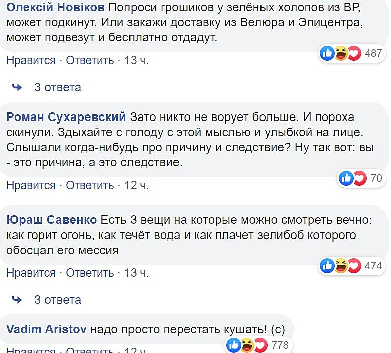 "Здравствуйте, уважаемые участники группы! Я, администратор этой группы, столкнулся с такой проблемой, что во время карантина почти не осталось денег. У меня на 5 человек семьи осталось 50 грн. Скажите мне, пожалуйста, как можно продлевать карантин все дальше и дальше, но при этом не выплачивать зарплаты людям, не выплачивать социальную помощь как в европейских странах, как в США? Зачем наш великий глава страны, за которого мы же и голосовали, и другие персоны из слуги народы, морят нас голодом? Почему не принимается моментальное решение выплачивать помощь безработным, выплачивать пенсионерам, мамам одиночкам, студентам? За что платить учебу студентам? За что оплачивать коммунальные услуги? За что кушать в конце концов?"