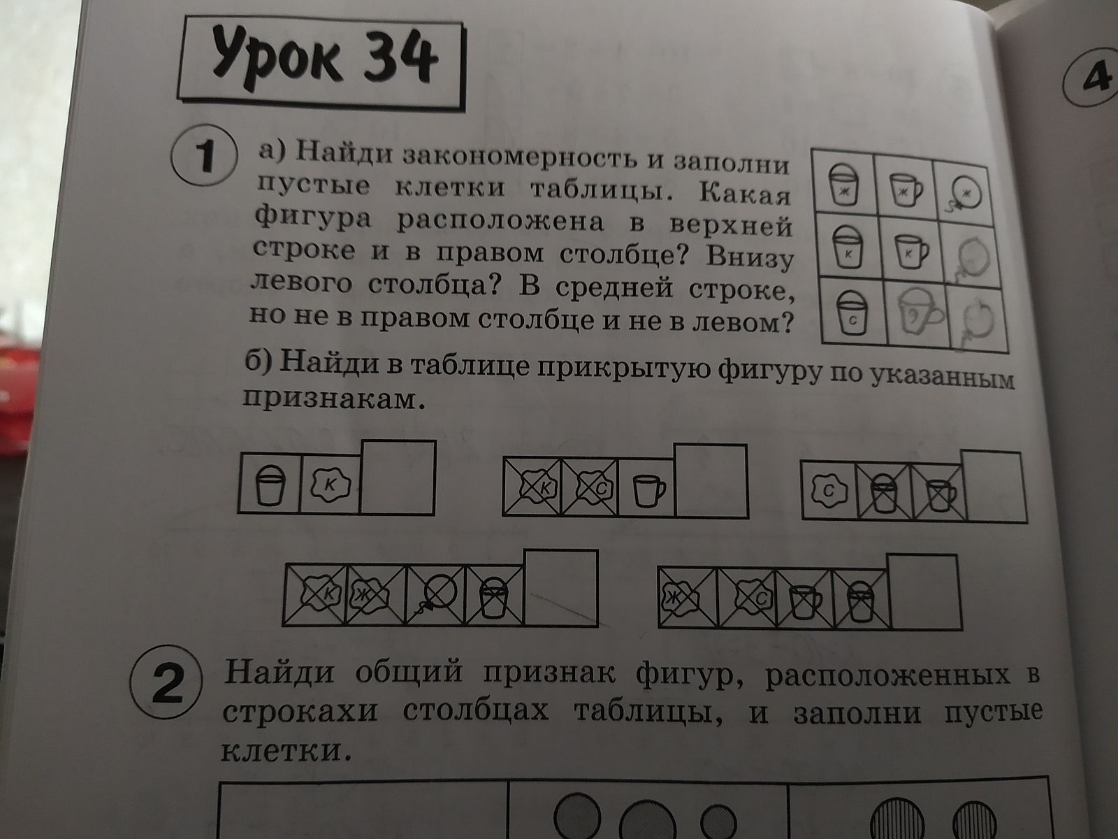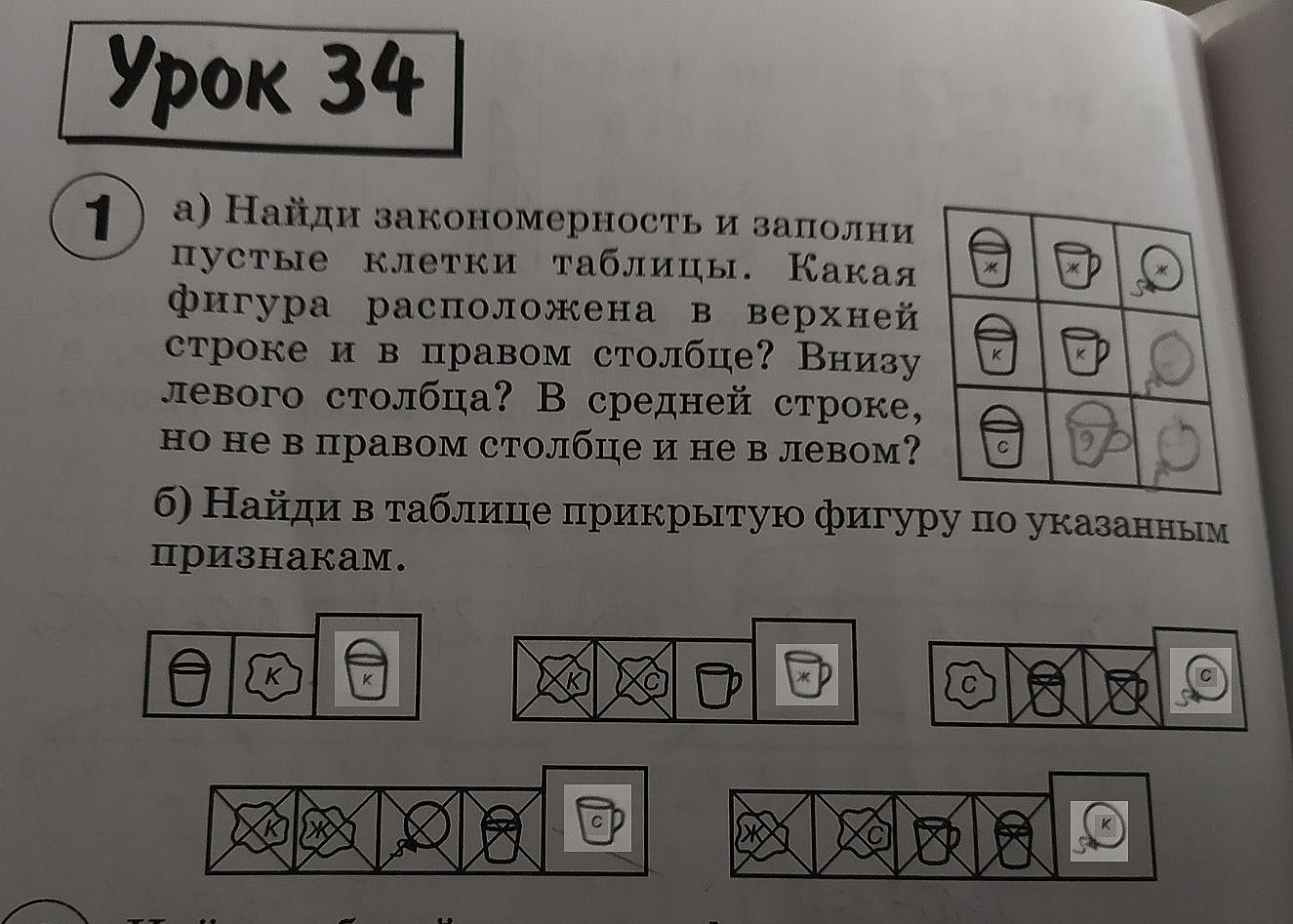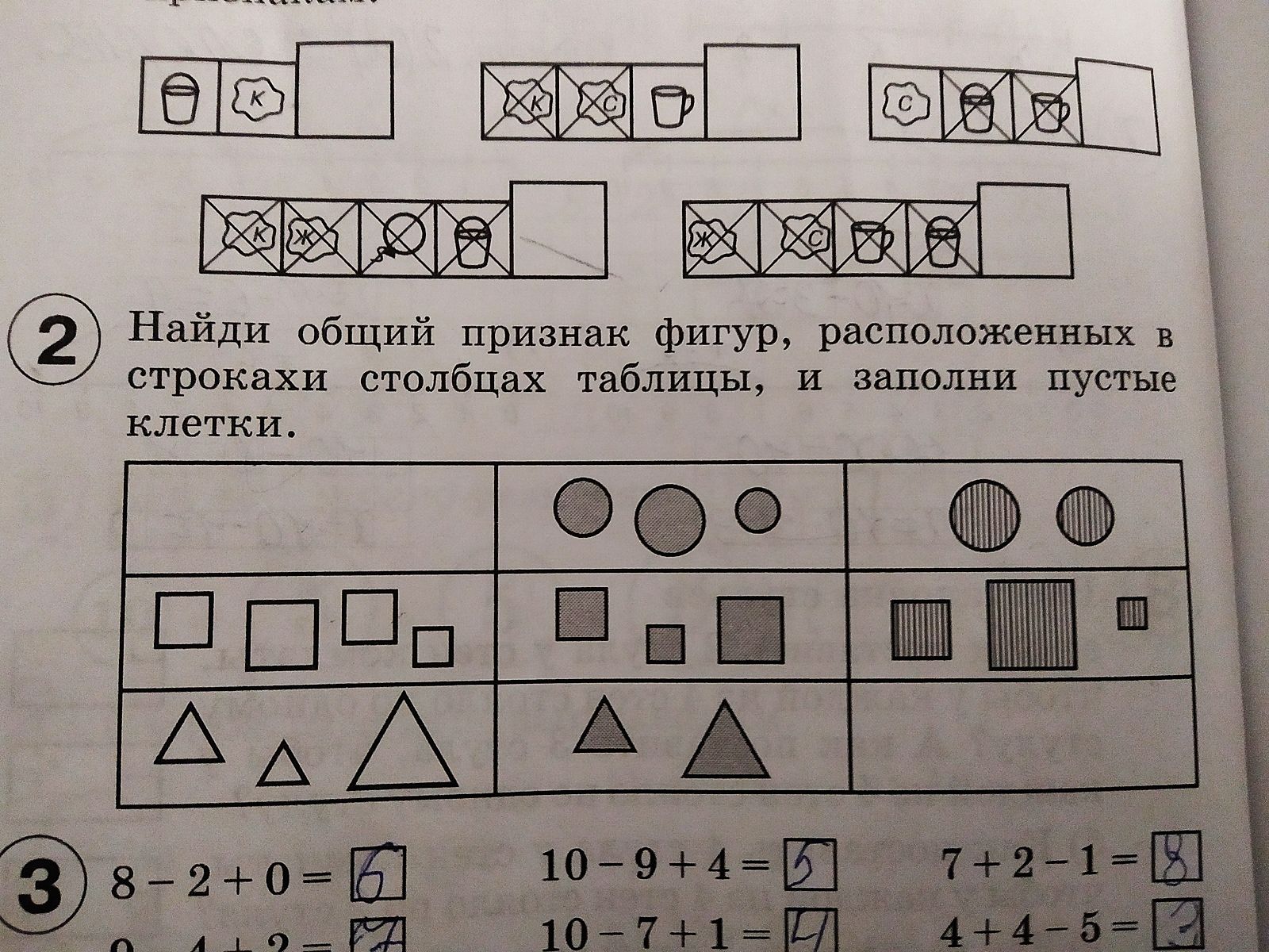 Друга ознака - це те, що в кожному стовпчику фігури згруповано за ’кольором’, третя - в кожному рядку однакові фігури (напр., квадрати).