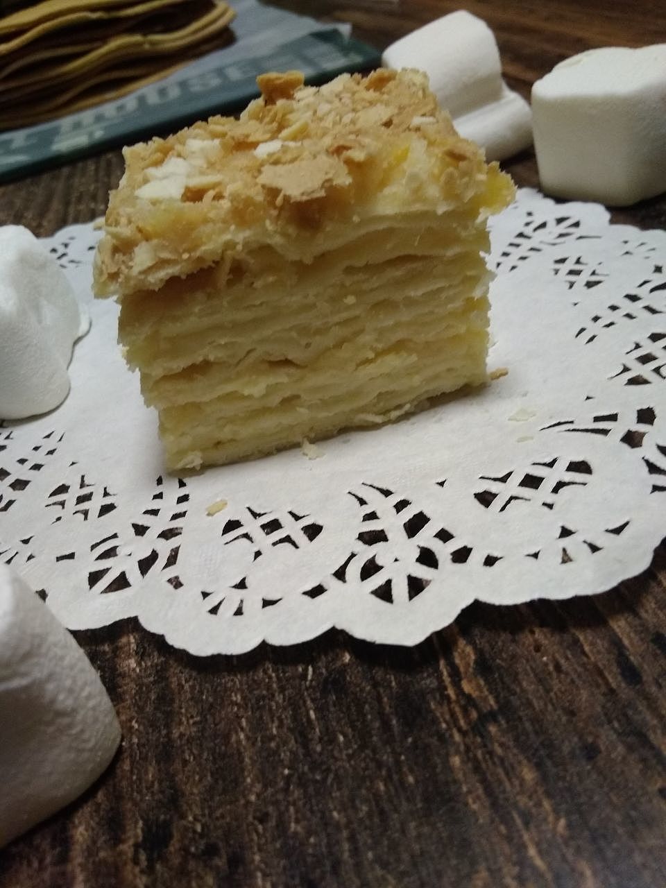Муки можно немного меньше положить,чтобы не забить,так как мука разная. Я пеку коржи, разрезаю их пополам,варю крем и сразу горячим кремом перемазываю. Сверху сахарной пудрой присыпать можно.