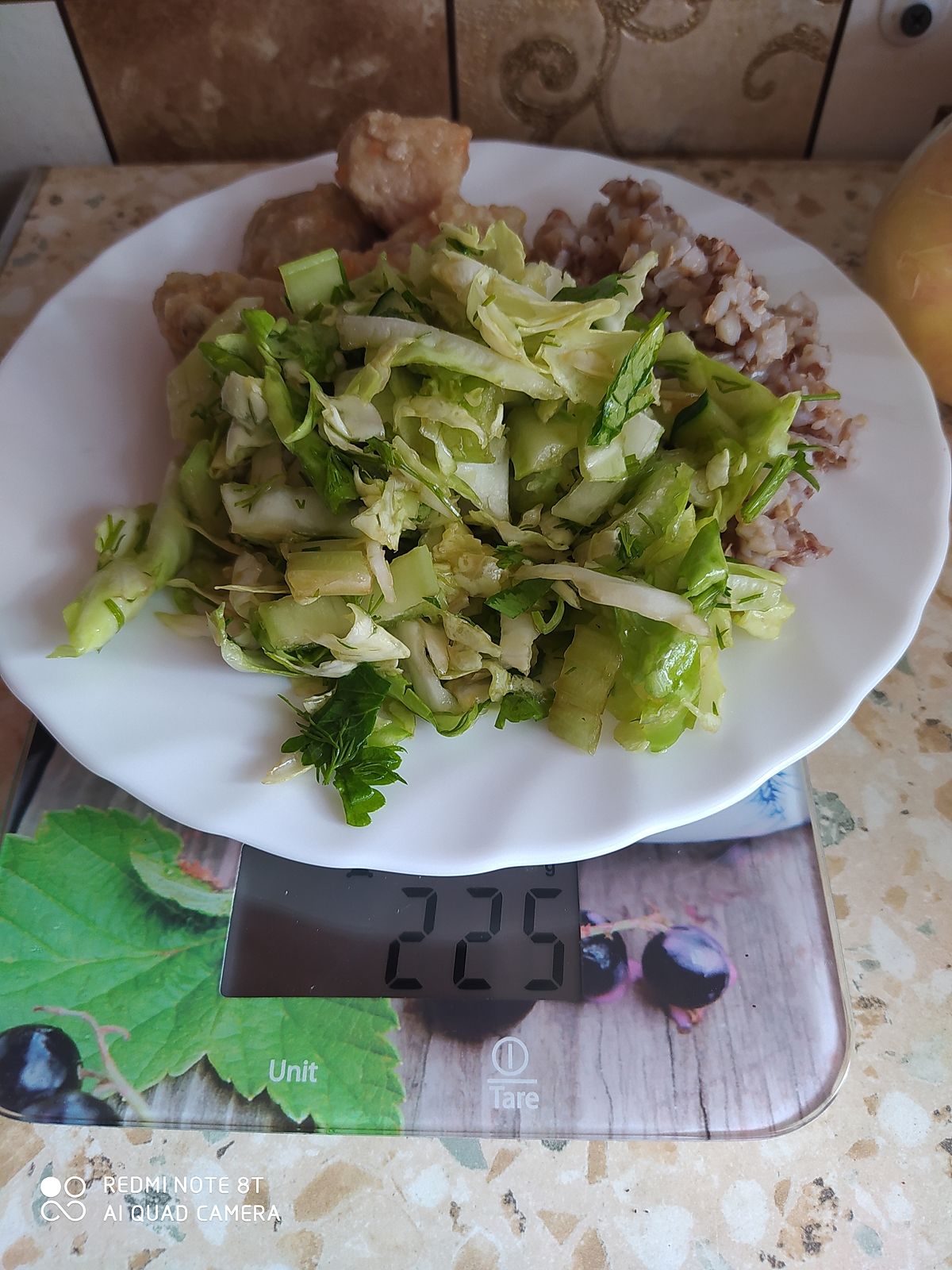 Обед: тушёное мясо 80 г,гречка столовая ложка,салат из капусты,с оливковым маслом сельдереем,огурцом.