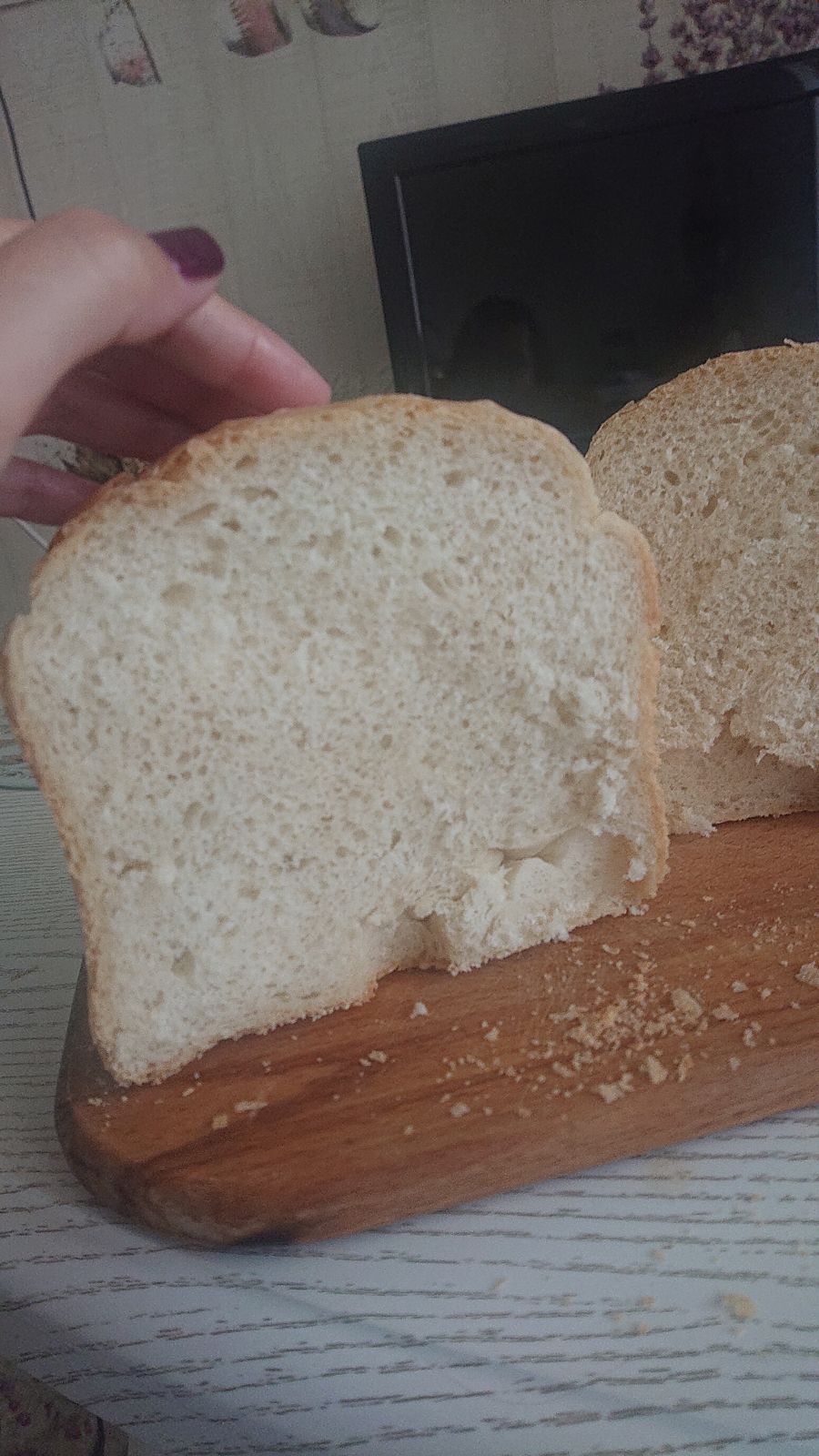 Я перечитала форумы и сделала поправки в рецепте по инструкции. Значит делала я на первый раз размер самый маленький. Программа 1. Чайную ложку дрожжей (мерная ложка из комплекта), насыпала на дно формы. Сверху просеяла 400 грамм муки Хуторок. Не взвешивала, весов у меня нет, использовала свой старый мерный стакан. Потом столовую ложку подсолнечного масла налиоа на муку. Потом воды, ее по рецепту надо 260 мл, я взяла 220. В ней растворила соль и сахар и вылила в форму. Вот результат.