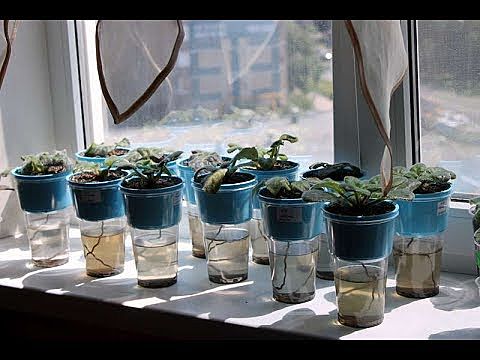 Если маленькие горшки, можно в стаканчики, а если большие можно один таз воды набрать, сверху какая нибудь крышка с дырочками и в каждой дырочке по шнурку по типу первого фото. Погуглите, есть много мастер классов от фиалководов