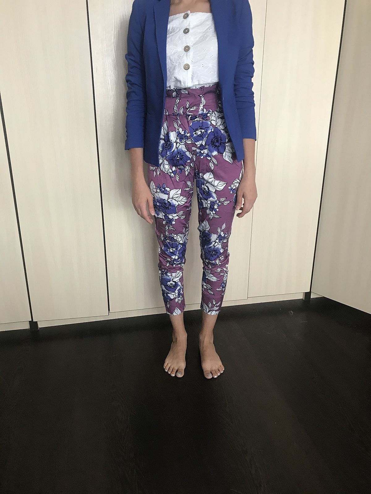 По отдельности все симпатичное. Вместе нет. Под эти штаны подошла бы белая майка в стиле белье. Под пиджак брюки в пол, а под топ юбка льняная в цвет пуговицам