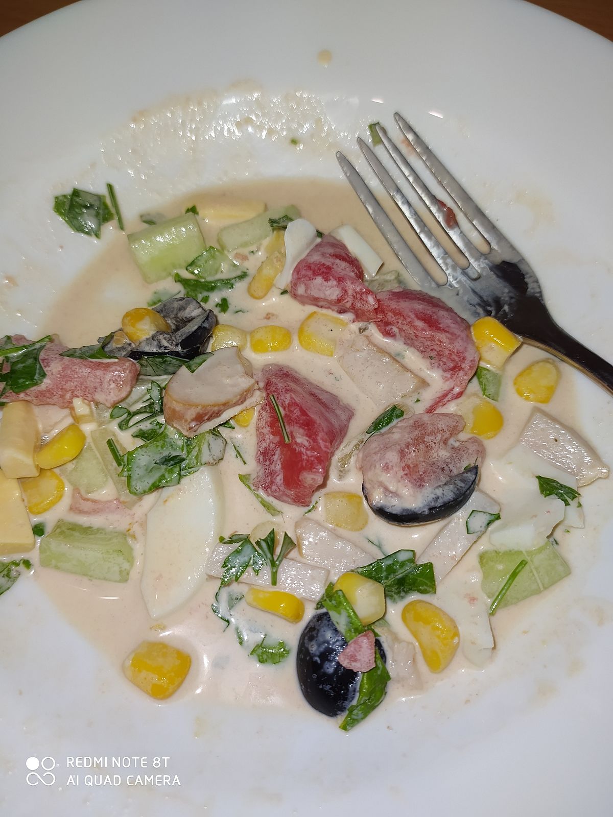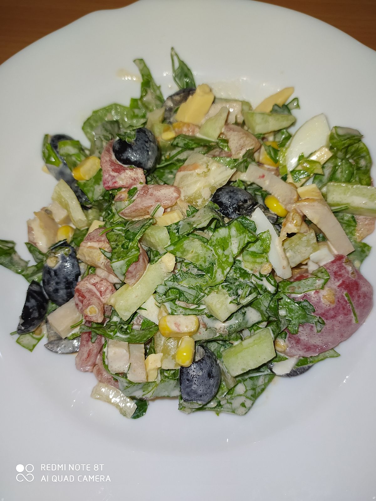 Скучно дома, муж в ночную. Наемся первый раз за день, заправлено, о ужас, майонезом. Огурец, помидор, кукуруза, перец болгарский, филе куриное копчено-вареное, оливки, сыр, зелень. Как-то так) Всем хорошего вечера!