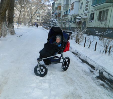 но коляска была бомбой с очень широкими колесами как боченки и перла по снегу и по бардюрам и в песке