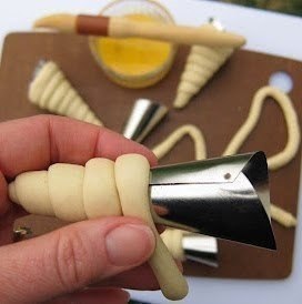 Сверните из плотного картона конусообразную палочку и намотайте на нее полоски теста, сделав «морковки».