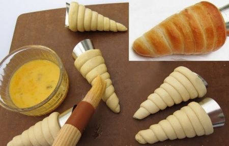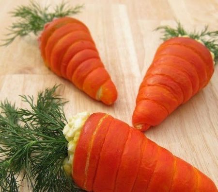 Положите трубочки из теста на противень, смажьте морковным соком с томатной пастой (можно взять оранжевый пищевой краситель) и запекайте до готовности в духовке.
