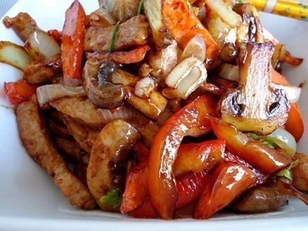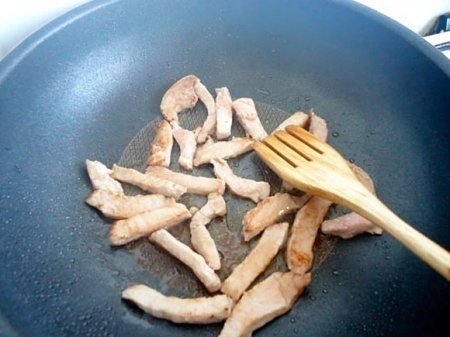 3. В раскалённом воке на большом огне на растительном масле быстро обжарьте в течение пары минут подготовленное мясо. Мясо в сковороду кладем порциями , что бы при выделении сока оно успело прожариться до появления золотистой корочки, а не тушиться. Овощи так же жарим порциями, пусть они останутся хрустящими и сочными внутри и сохранят свой яркий цвет. Не пережарьте стир фрай.Овощи должны получиться так скажем на зубок.