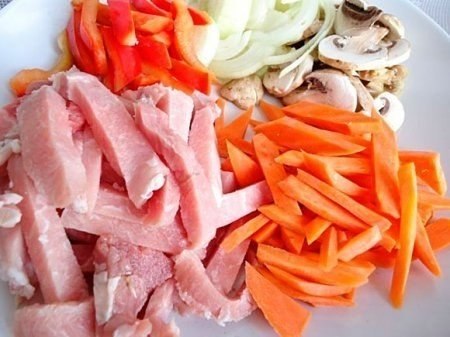 2. Далее нарезаем все продукты удобными для вас кусочками одинакового размера.