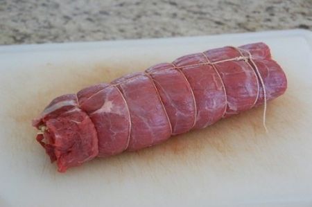 3. Положите говядину на широкую доску, возьмите широкий нож и аккуратно разрезайте кусок вдоль волокон. До конца не разрезайте, иначе у вас получится два куска, а нам нужен один, толщиной примерно один сантиметр. Посолите равномерно и посыпьте черным молотым перцем. Выложите начинку и равномерно распределите ее ложкой по всей поверхности, только с одного края оставьте свободными примерно два сантиметра. Сверните говядину в рулет, очень аккуратно, чтобы начинка не смещалась. Чтобы рулет держал форму его нужно перевязать шпагатом или другой подходящей прочной натуральной нитью. Выложите нарезанный лук на сковороду, положите сверху мясной рулет, швом вниз. Налейте на сковороду томатный сок и белое вино. Закройте рулет фольгой для запекания и поставьте в духовку, предварительно разогретую до 180 градусов. Запекайте рулет банкетный 2 часа. Затем вынимайте рулет из духовки и оставьте остывать. Фольгу не снимайте, чтобы мясо не заветрилось. Когда рулет полностью остынет, снимите фольгу и переложите его на разделочную доску. Перед тем, как подавать рулет, не забудьте снять шпагат.