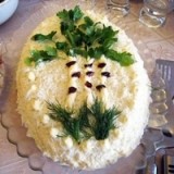 Сверху салат украсить полосками чернослива, в виде ствола березы.