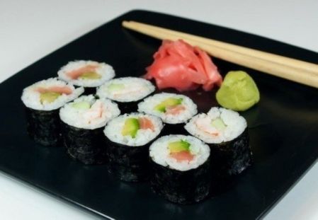 Режем на 6 кусочков. Чтобы рис не прилипал к ножу, перед каждым разрезанием окунаем острие в воду и переворачиваем нож, чтобы капли пробежали по режущей кромке. Подаем роллы с имбирем, васаби и соевым соусом