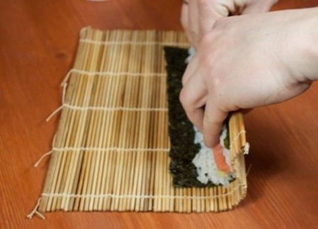 Начинаем сворачивать. Большими пальцами обеих рук приподнимаем край коврика вместе с нори, при этом придерживая указательными и средними пальцами начинку. Сгибаем коврик под прямым углом по линии, на которой лежит начинка