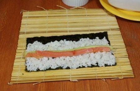 Рис раскладываем на нори слоем около 3-5 мм.Ребром ладони делаем небольшой длинный желобок посередине разложенного риса. Слегка смазываем его васаби. Кладем в желобок начинку (лосось+огурец или лосось+авокадо)
