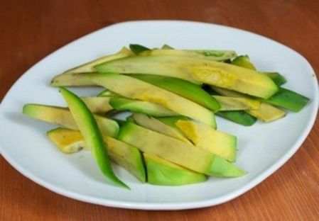 Авокадо разрезаем пополам, удаляем косточку, очищаем от кожуры и нарезаем на полоски