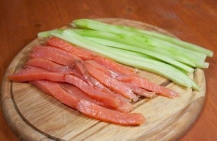 Подготавливаем начинки. Огурец очищаем от кожицы, вырезаем семена и нарезаем на тонкие полоски.Рыбу тоже нарезаем на полоски