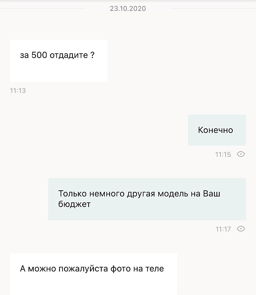 Знаете, я не против фото. И если есть возможность всегда даю фото, на теле тоже, замеры. Но когда сходу, ни здравствуйте , отдайте за пол цены. Ну просто не выдерживаю)