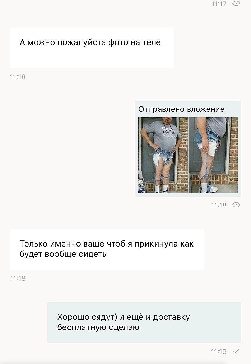 Уже можно мемуары писать про покупателей, поражают. Говори хочу очень ваш товар но хочу на почте померить как сядет, отпарите наложенным. Отвечаю да, по предоплате за доставку. Тут же пропала, уже и не сильно хотелось. Про фото бирки, на теле, живое фото , неживое, пор свете, при Луне это само собой. Торг необоснованный на авось тоже любимое. Но сегодня прям настроение было веселое у меня. Продаю новые джинсы за 800 грн. Пишет покупатель ( фото добавляю ). Сижу ржу сама с себя)