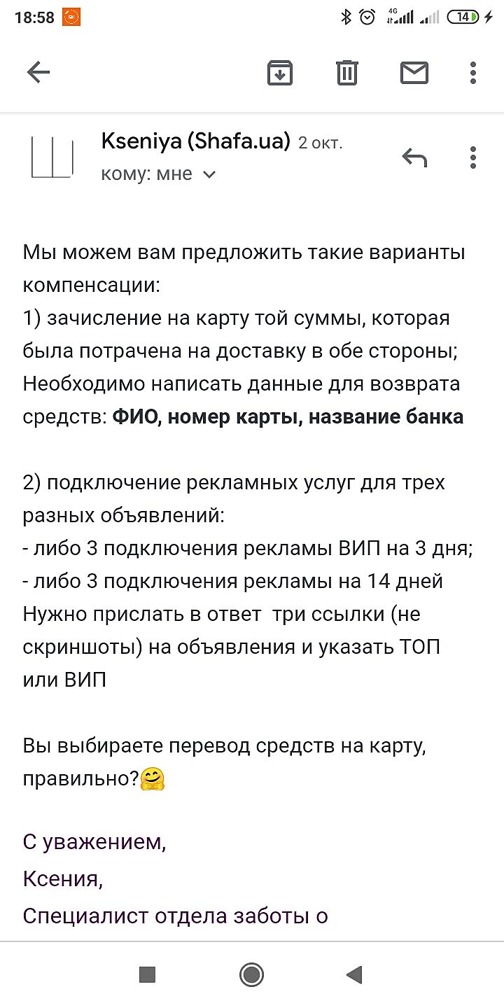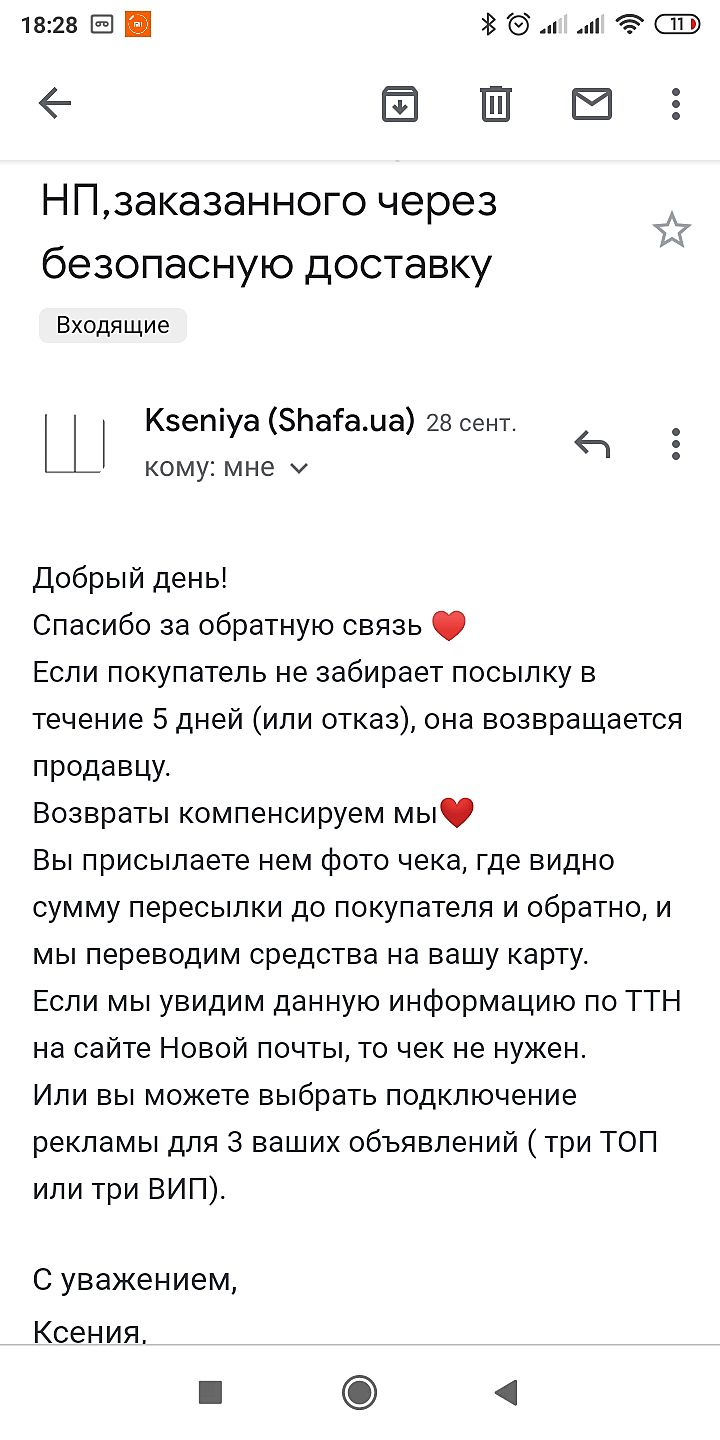 1 раз был отказ на нп - заплатила свои деньги за доставку, потом админы перевели деньги на карту ,или предлагали завести на счёт Шафы
