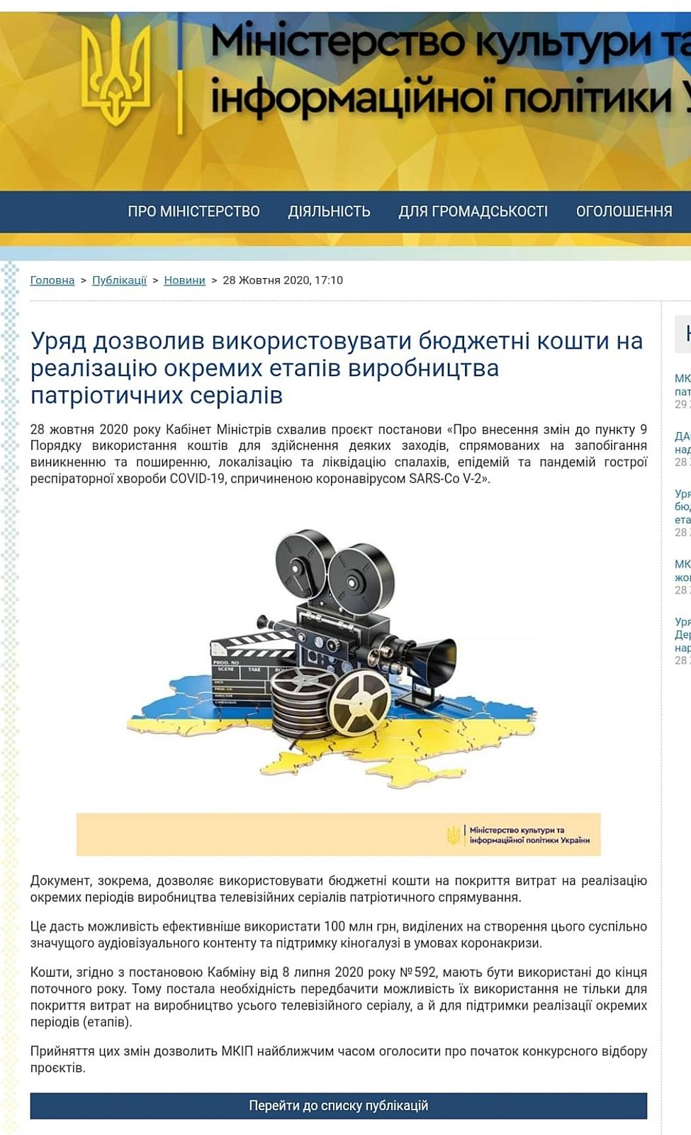Кабин утвердил выделение 100 млн. грн. из ковидного фонда на сериалы.