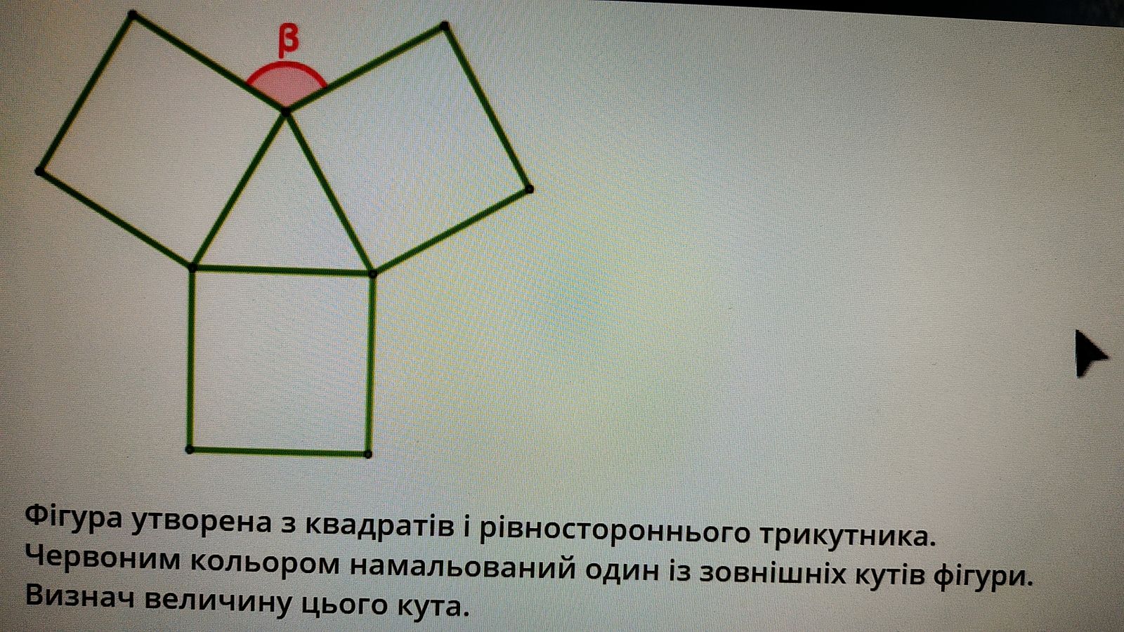 Все углы - треугольника, 2-х квадратов и раскрашенного составляют полный угол-360°. Угол Δ-ка =60°(он равносторонний), а квадрата -90°. Поэтому внешний угол = 360-(90+90+60)=360-240=120