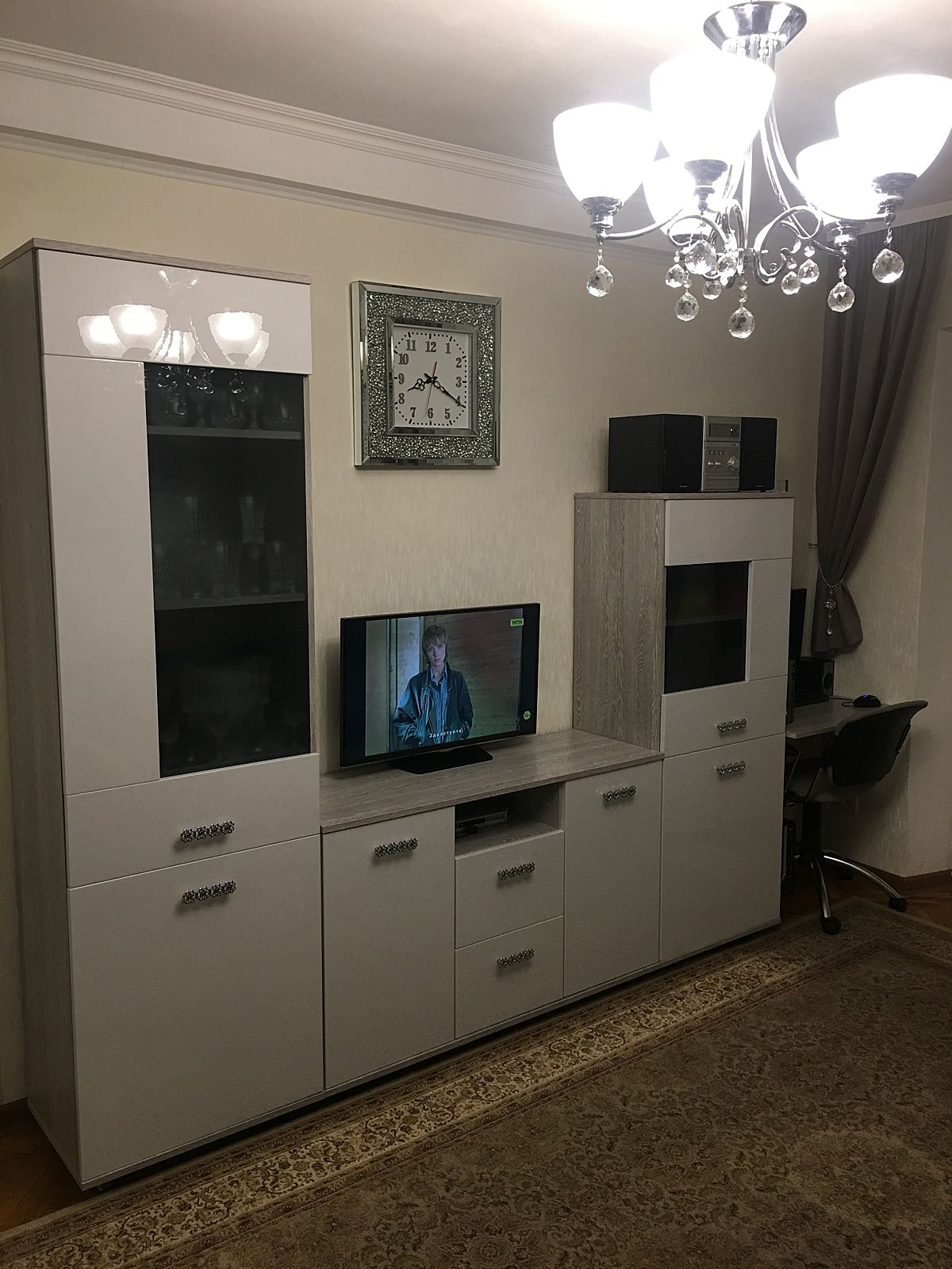 У меня гостинная комната еще служит и комнатой дочери, которая с нами не живет, но иногда приезжает и живет несколько дней. Поэтому заказала в гостинную шкаф, узенький стеллаж для декоративных элементов и тумбу под тв. Все это со стеклянными фасадами. Как оно будет, еще не знаю, пока жду установку. Но концепция такая, чтобы было функционально под наши потребности