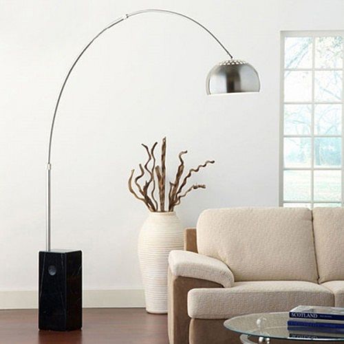 А в самой комнате ТВ на стене, под ним длинная подвесная тумба, напротив угловой диван и большой светильник на длинной ножке.