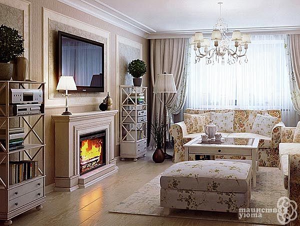 Удобный большой диван или диван + кресло + софа, на стене телек, под ним длинный низкий шкаф 75-80 см с закрытыми не стеклянными дверцами. Журнальный столик, можно трансформер.
