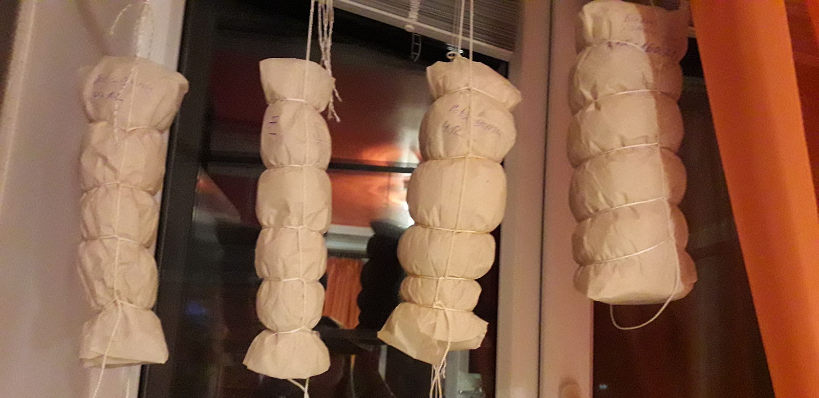 Так куски разного мяса: свинина, говядина, индейка, курица. Только подвесили. Муж загорелся сделать вяленое мясо и типа ’хамон’, часть вымочил в рассоле, а несколько кусков еще лежат в сухой соли, потом промыл, обкачал в специях, замотал в марлю или пергамент и повесил сушиться. Посмотрим, что получится. Первый опыт. Но пахнееет