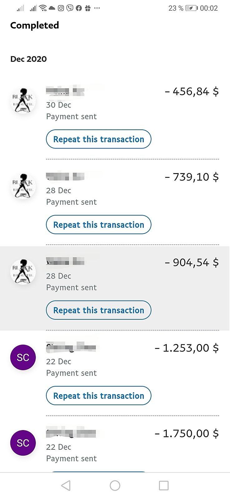Почему не может?) Объясните? вот мои заказы для бизнеса, оформленные от частного лица, оплаченные через пейпал с частной карточки ПриватБанка, последняя неделя декабря). Это оплата товаров, которые едут в посылках, для последующей реализации в магазине. Посылки идут через день. Суммы заказов видите?