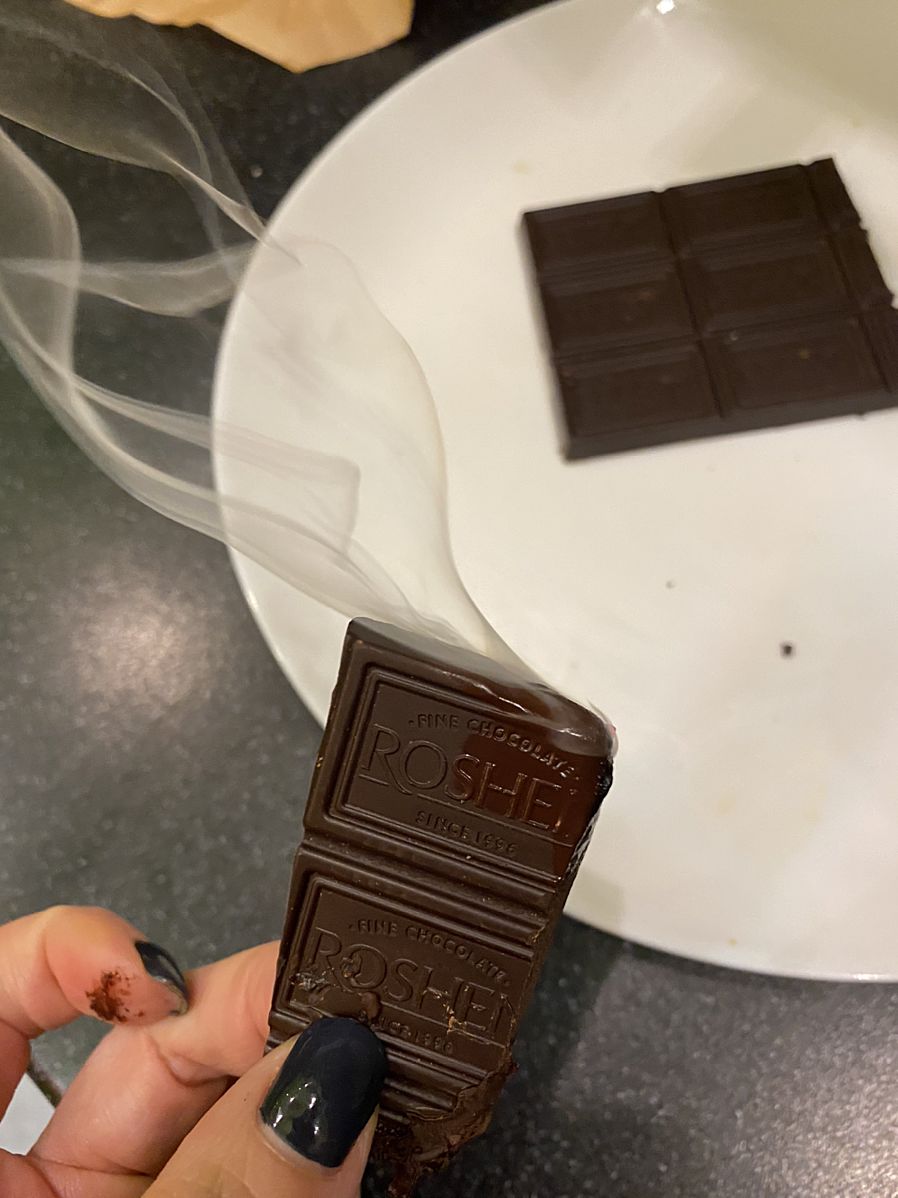 У вас есть сейчас возможность подпалить шоколадку? Я подпалила кусочек горькой плитки Рошен. Она горела с пламенем и влияла резким запахом жжёной резины. Если есть у вас шоколадки других марок, попробуйте. Интересно. Нет, ни антиреклама, просто вонзим нереальный. Хорошо что я не ем шоколад вообще. Просто в дом принесли гости к столу.