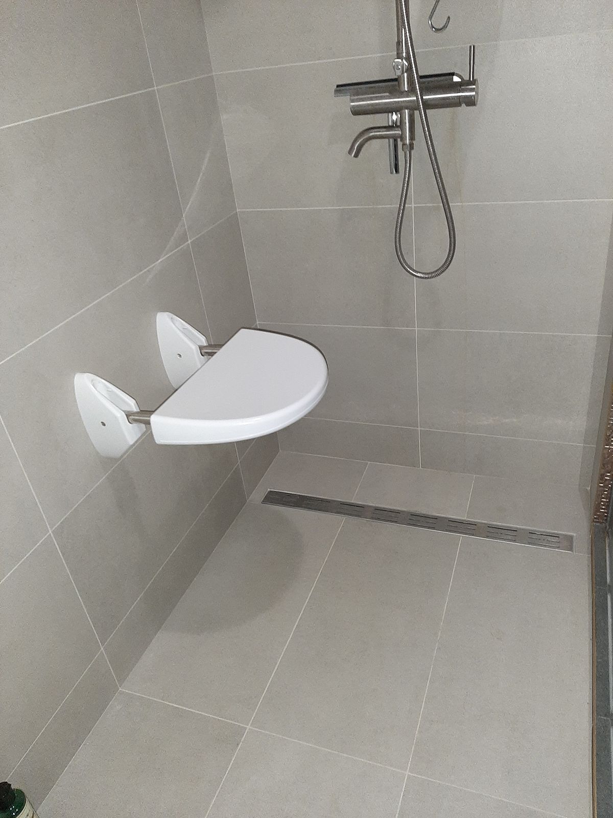 Поищите, в интернете много картинок, где стульчик делают из плитки типа скамеечки или угловой полочки. Типа такого как ф.1. А есть откидные сидения, мы себе такое смонтировали