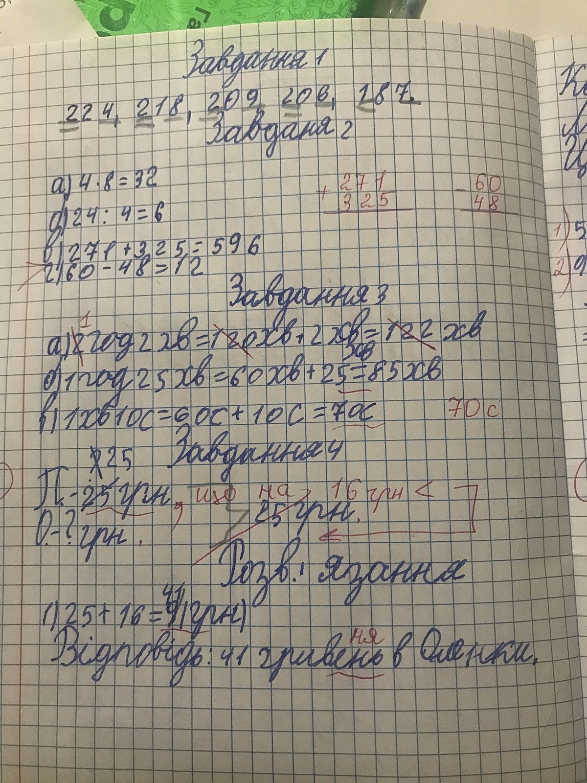 Посмотрите на работу внимательнее, без эмоций. Ошибок много. Краткое условие (то есть логическую схему задачи) записывать не умеет. Составлять выражение (вираз) тоже (ощущение, что списал или по аналогии хотел подставить, потому что числа верные, а операции с ними нет). Также 6 задание похоже списал, потому что ответ 25, а потом 40,то есть не понимает, куда что писать. Работа слабая. Но ругать не стоит, конечно. Лучше об´ясните ему, как правильно