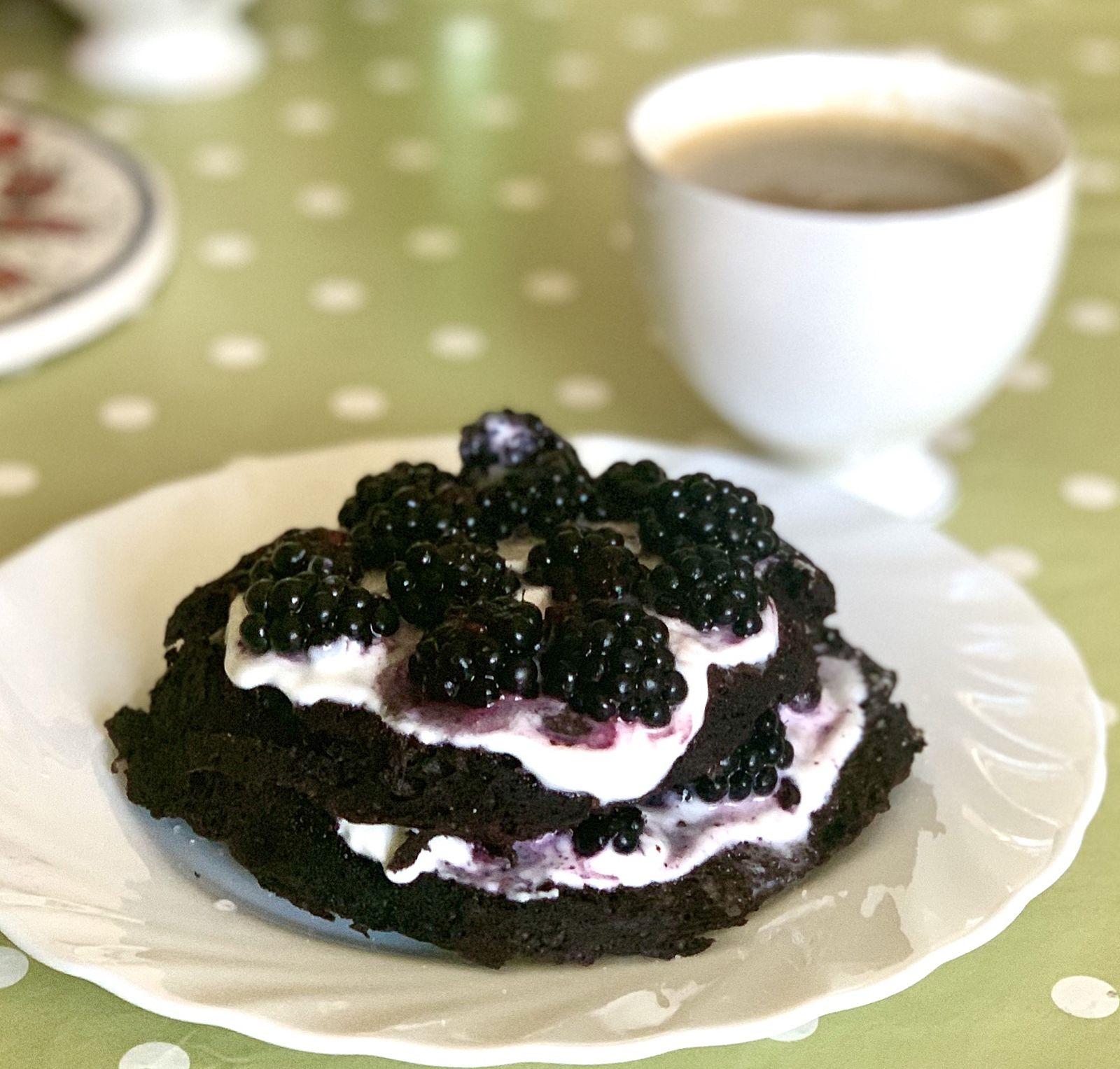 Банан 1 шт. разминаем вилкой, добавляем яйцо 1 шт., просеянное какао 35 грамм, разрыхлитель 0,5 ч.л., сахарозаменитель и хорошо перемешиваем. Перекладываем тесто в форму и отправляем в микроволновку на 4 минуты. Разрезаем наш торт, нижний корж смазываем йогуртом густым 150 грамм, выкладываем ягоды, накрываем вторым коржом и повторяем процедуру.