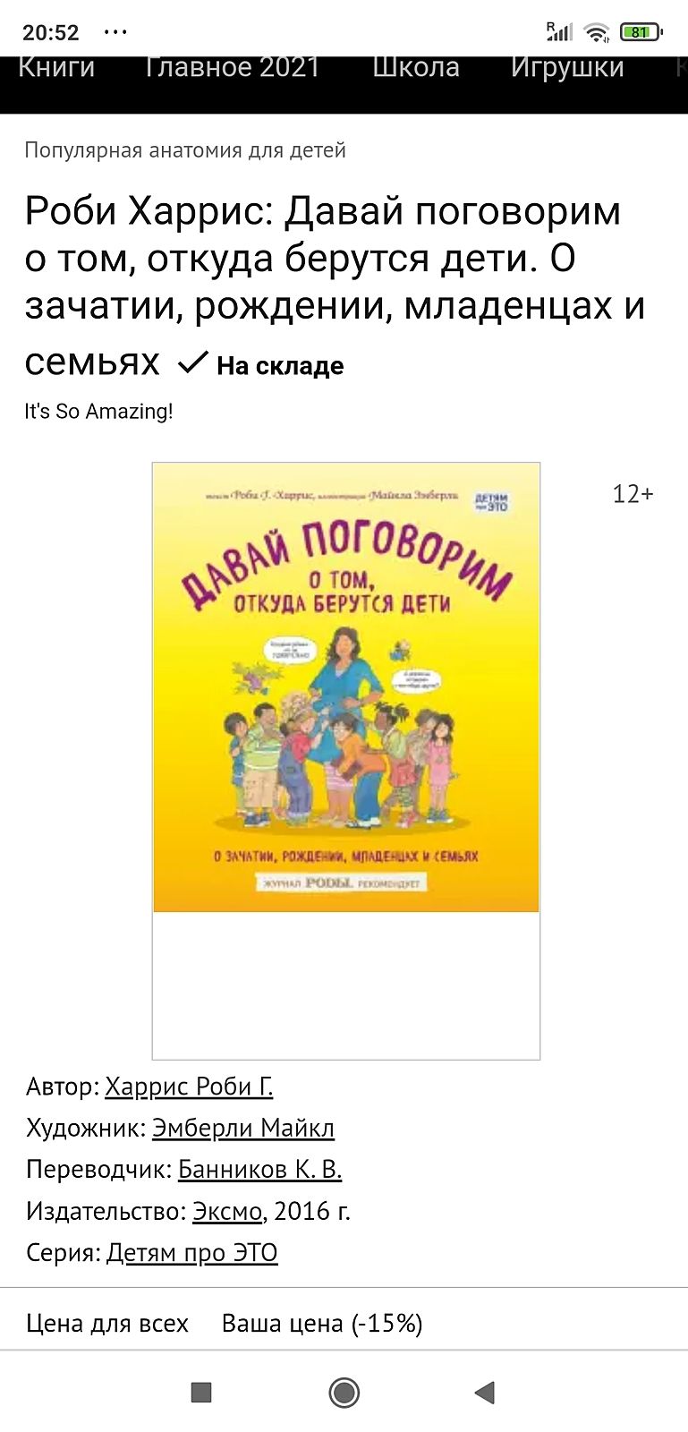 Не акцентирую на этом внимание. Это есть в жизни, было и будет. Жесткое порно в фильмах не показывают. Элементы секса, прелюдия и все такое не тайна для ребенка. Я не прикидываясь перед детьми ханжой. И не ойкаю увидев на экране письку. Интернет контролю. Книгу про отношения купила ещё год назад. Про тело человека - все дети изучали лет с трёх примерно.