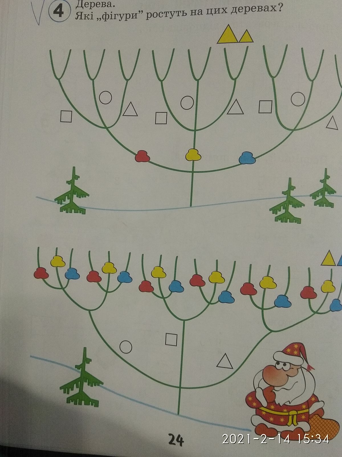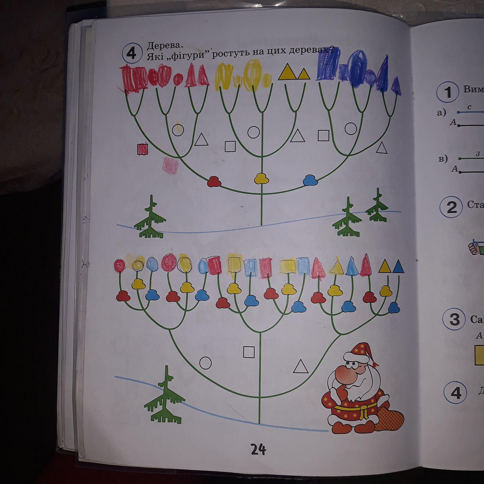 Первая верхняя картинка: слева направо : два красных квадрата, два красных круга и т.д., у вас есть подсказки под ветками, фигура и цвет)