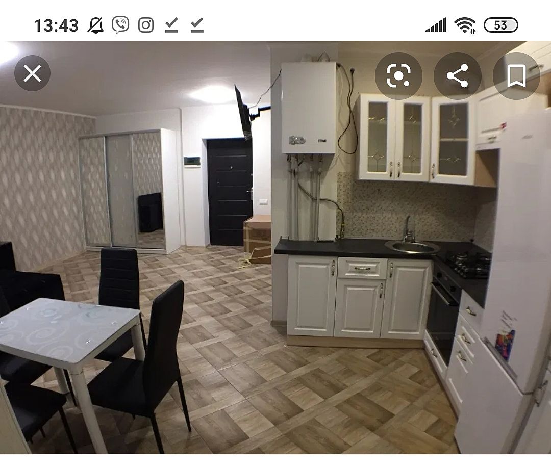 Первая комната вашей семье, во второй комнате спит мама. И ещё есть кухня обьедениная с залом и входом в квартиру, там стоит диван на котором спит папа (типо опен Спейс, все стены снесены в кухне студии, также как на фото, только ремонт и мебель старый ).