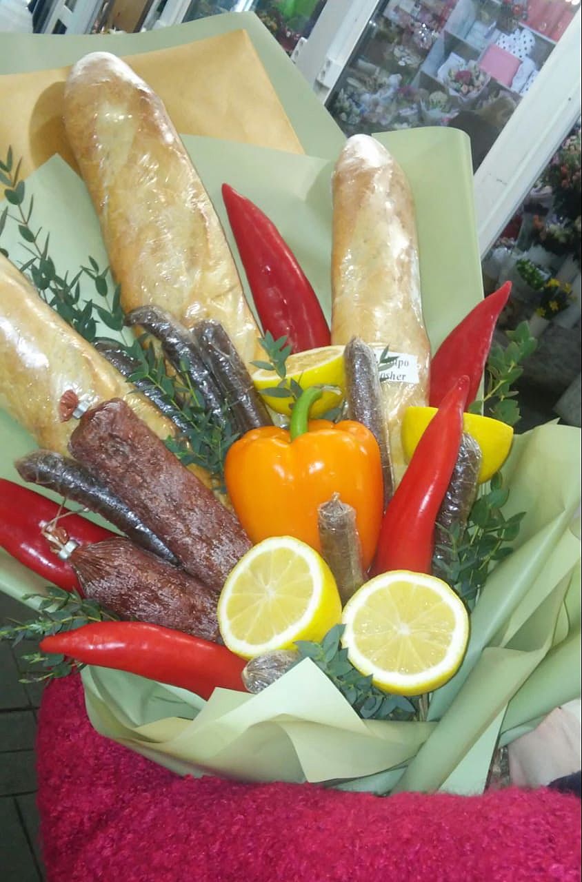 И у нас в частной дарили колбасный букет))правда не нарезанное,а в букете целая палка,батон и тд
