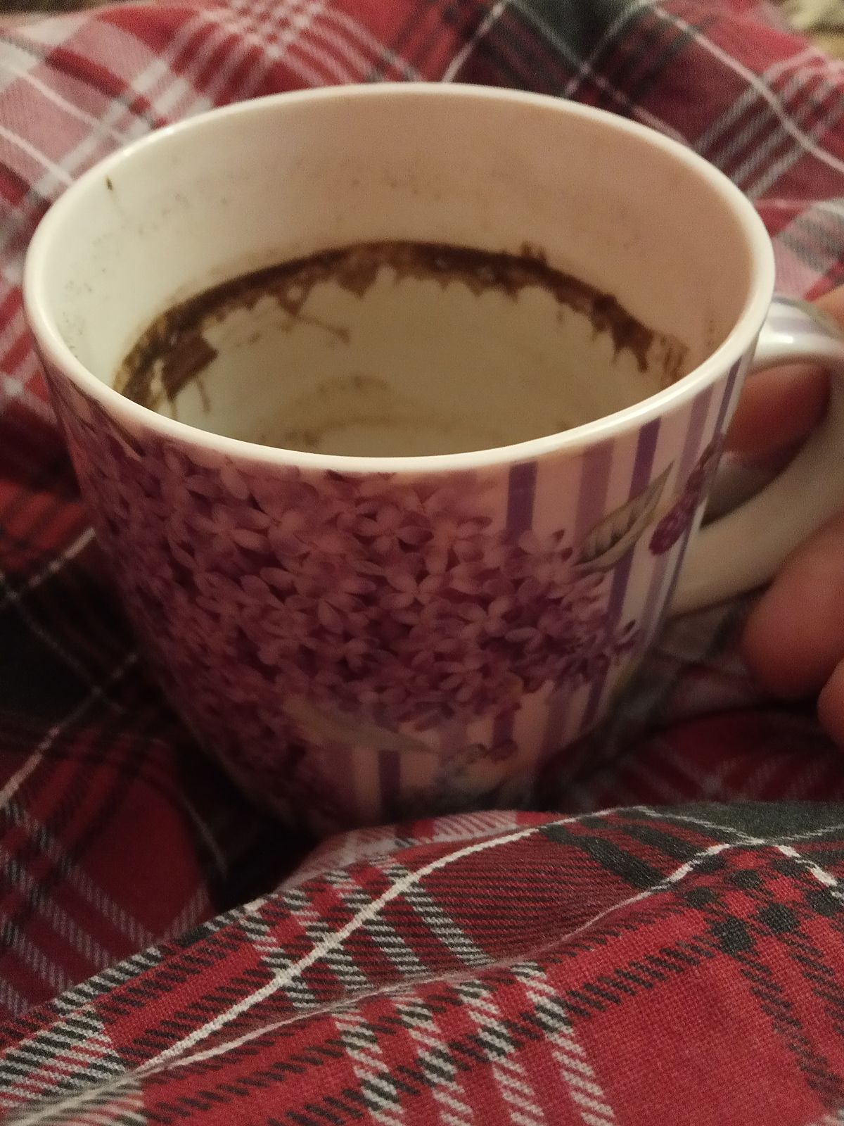 Вот блин, я уже все сожрала. Были макарошки с бефстроганов и капустный салат, с много зелёного лука, огурчиком и пахучим маслом, таблетка Детралекса и кофе