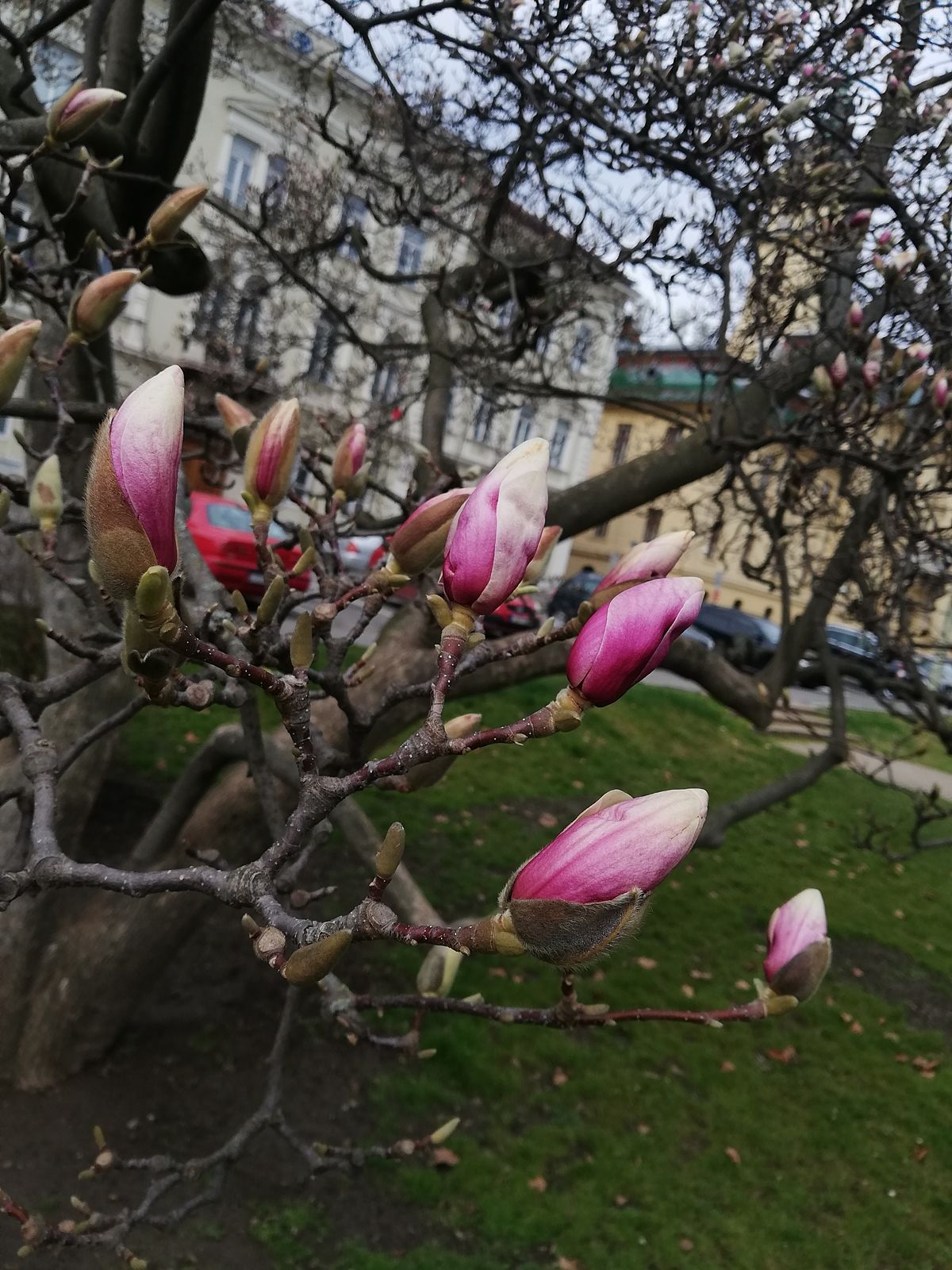 Цветёт дикая яблоня, магнолия сегодня-завтра расцветает, тюльпанчики уже см 10.