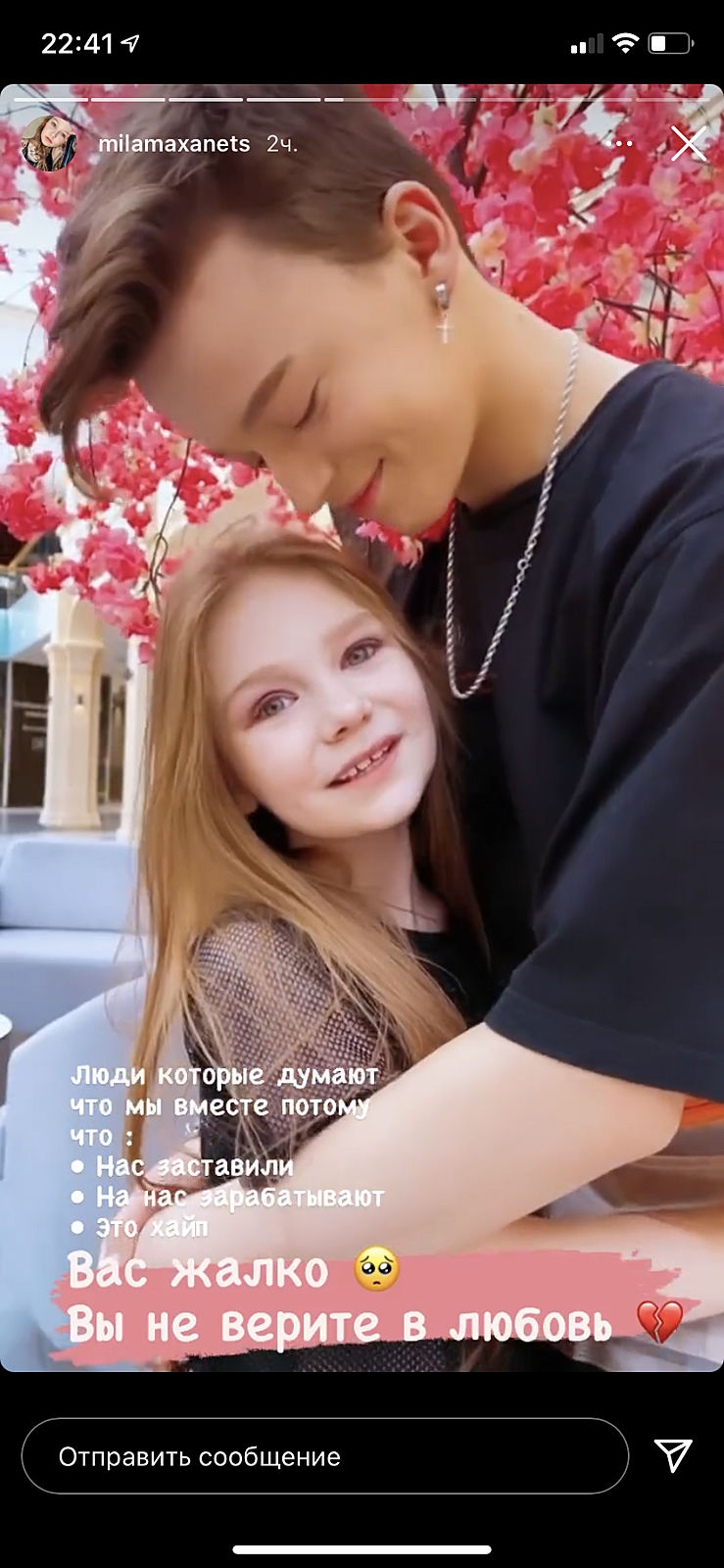 Если бы не этот пиар, на который маме хватило мозгов с её отклонения , никто бы не знал о ней и её дочери. А так хайп, подписчики, дальше рекламы, получается на дочери она и зарабатывает и дуру из себя строит ’мол верите ли вы в любовь’
