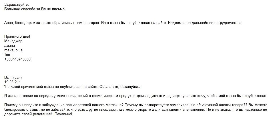 Суть в том, что мой отзыв так и не опубликовали. После этого я отправила вопрос на емейл, по какой причине мой отзыв сняли с публикации и какая цель их вчерашнего звонка. ....... Я снова пишу, что настаиваю на публикации отзывы и не хотела бы, чтобы мейкап содействовал сокрытию правдивой информации.