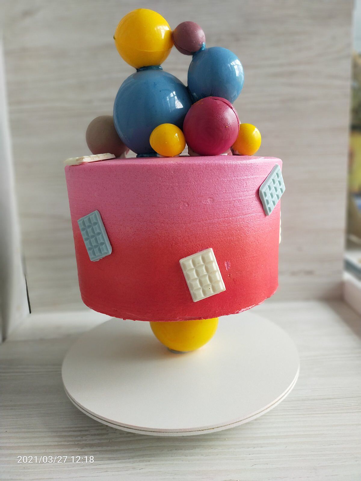 Неаккуратно, потеки на шарах, странно они выложены, цвета не гармонируют, а шоколадки эти на боковинках непонятно зачем