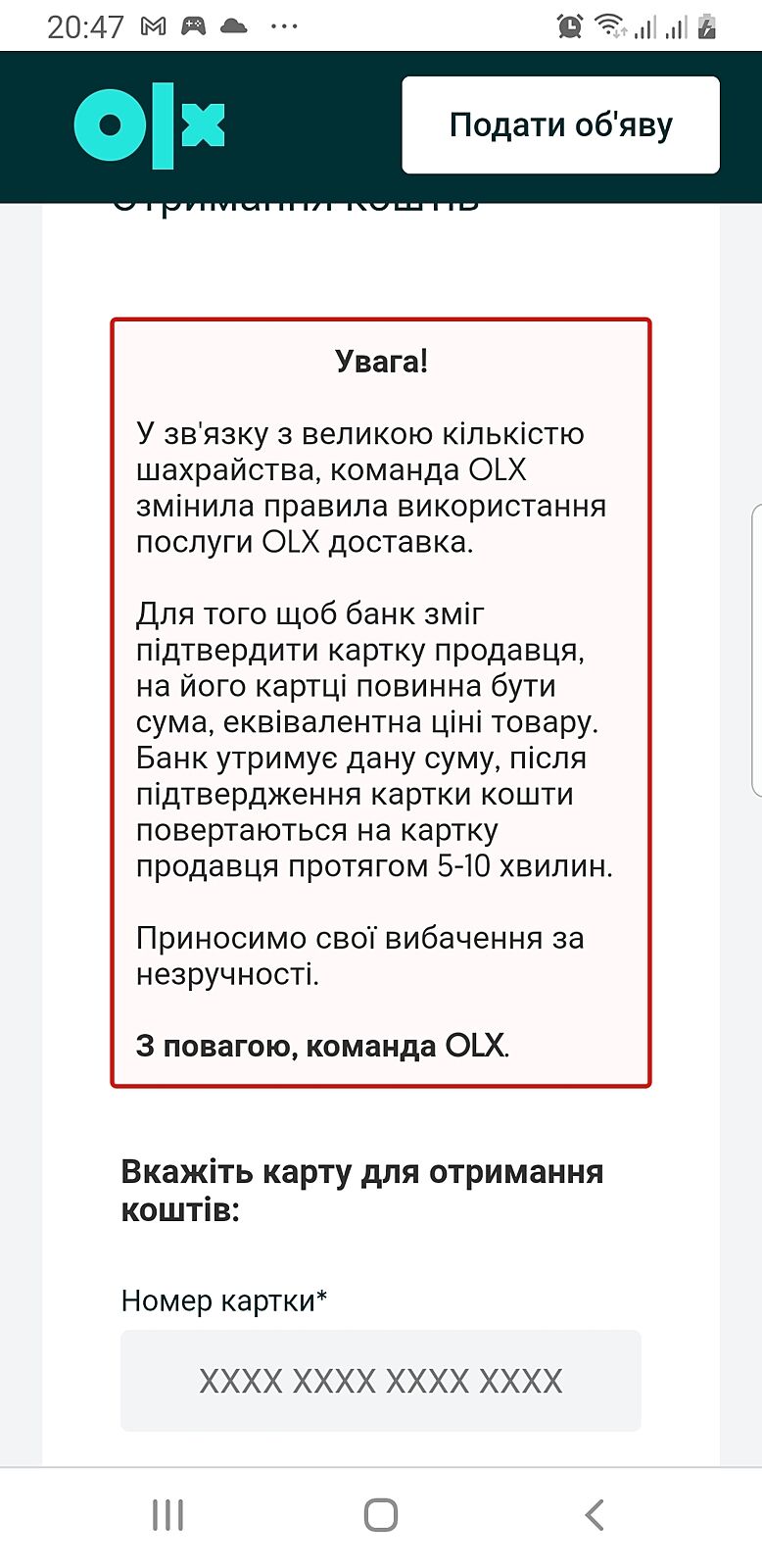 Просто покупатель купил товар с олх доставкой. Мне пришло уведомление для дальшейших действий. И когда я введа свои данные, пришла вот такая картинка
