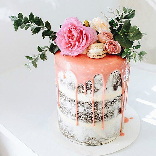 Автор, не вздумайте портить торт шоколадными подтёками или присыпкой. Голый торт - это минимализм. Фрукты или цветы.