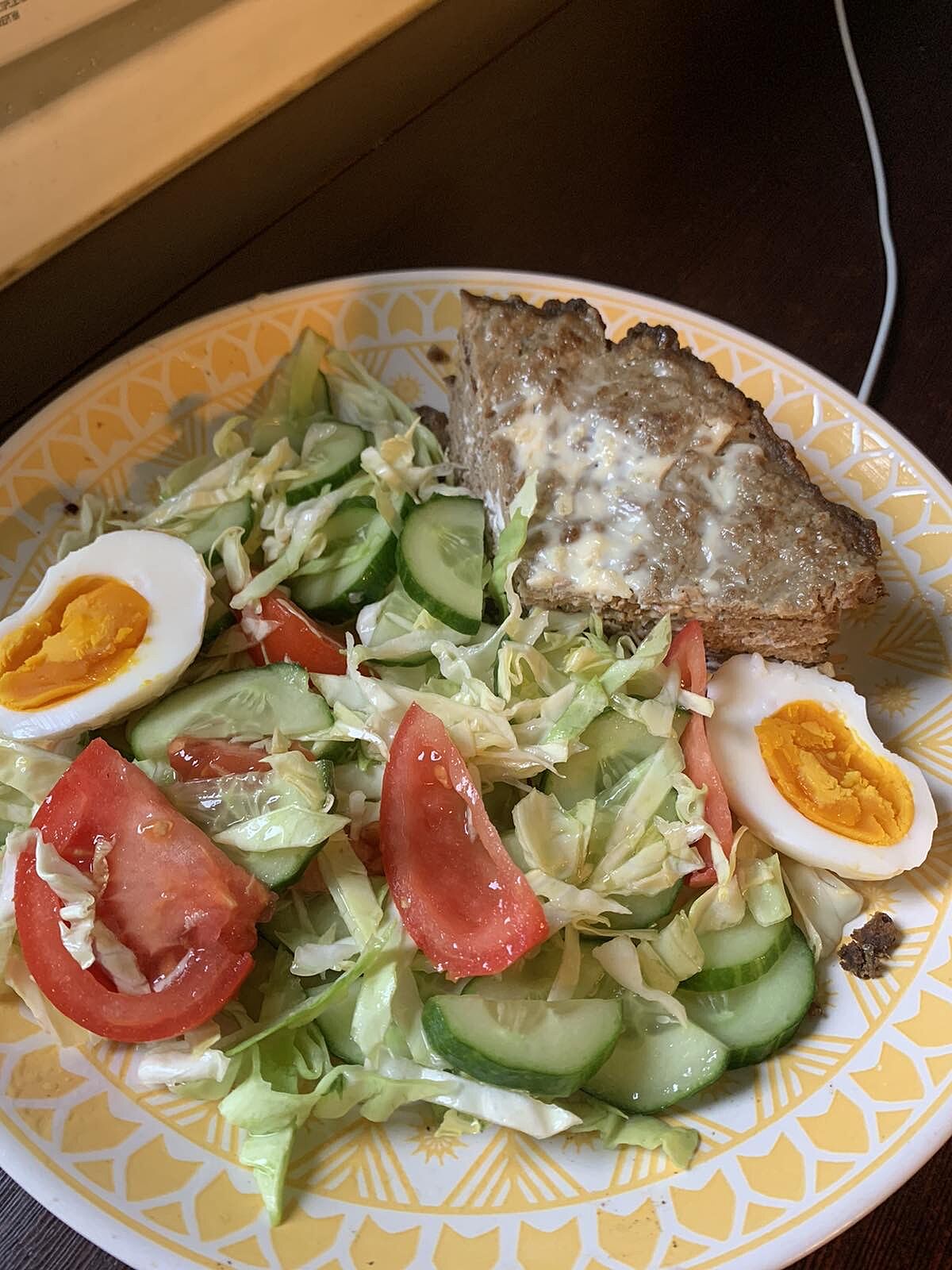 А вообще был печеночный торт и салат из редиса, огурца и черемши.