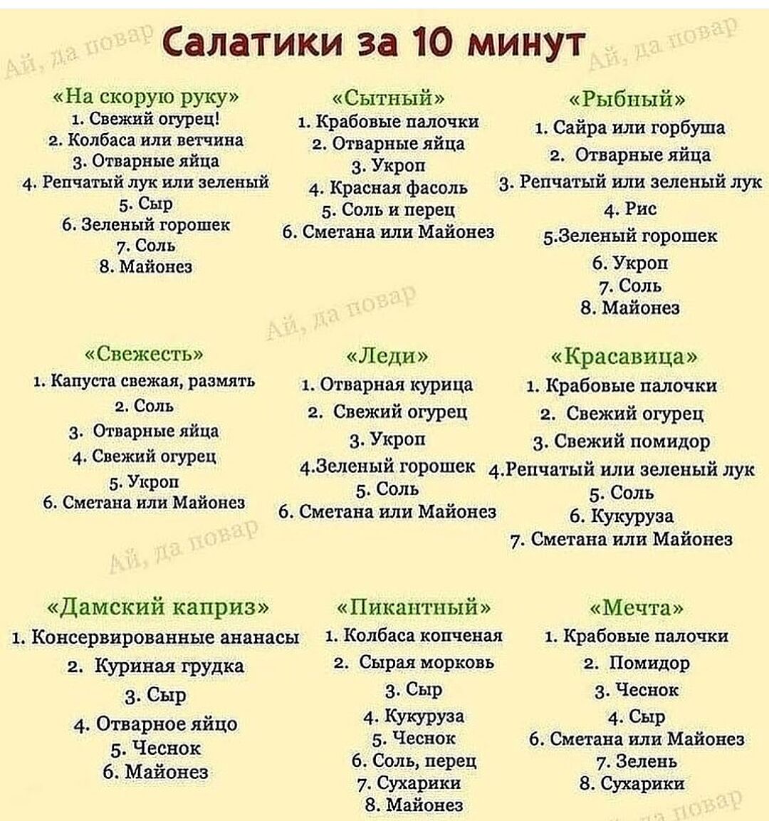 Я люблю легкие салаты на основе микса салатов+ помидоры чери, пармезан, а дальше что есть, например креветки или тунец ,или груша, апельсин, хамон и заправка из ол.масло + лимон, горчица, можно пед.
