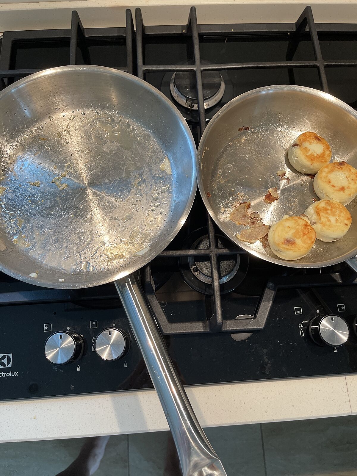 Вот яйца и сырники пожарила, чуть прилипает. Меня устраивает. И еда вкуснее.