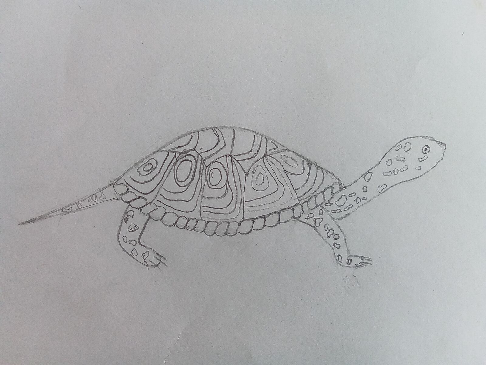 Вообще замысел был рисовать черепаху как в жизни. Вот поэтому была попытка нарисовать каждую чешуйку панциря, пятнышки на лапах и тд. Наверное, если бы у художника хватило терпения и он раскрасил черепаху, то выглядело бы лучше.